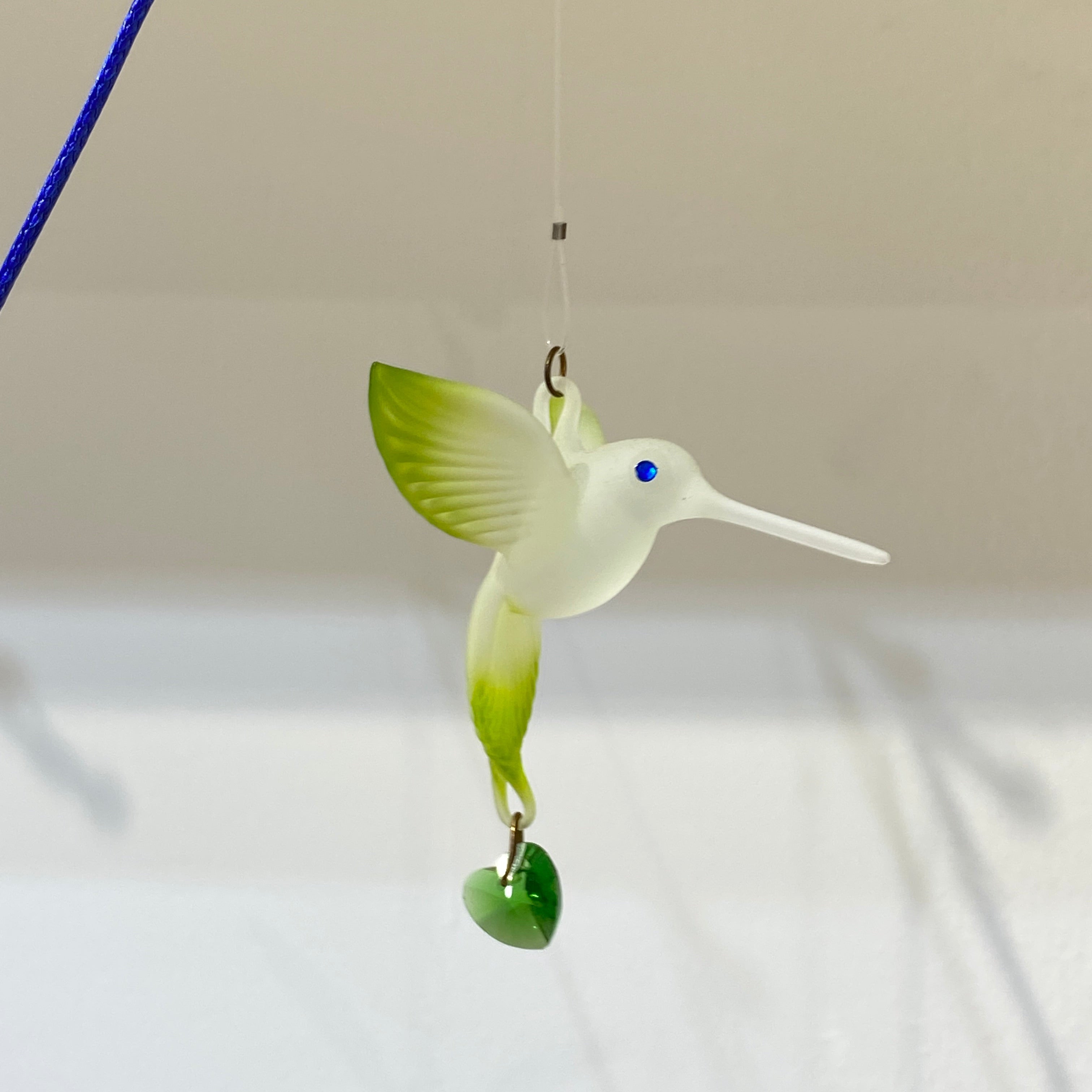 This delicate charm is made of frosted glass, capturing the quiet motion of a hummingbird suspended in time. Available in soft green and violet, each piece is tipped with a heart-cut crystal bead that catches the light with every movement.