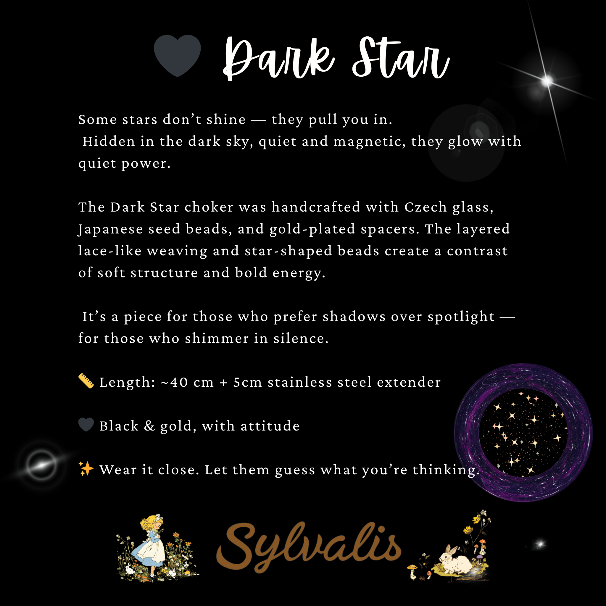Using a curated mix of black Czech glass star beads, Japanese seed beads, and gold-plated spacers, you’ll assemble a piece that feels bold yet intricate — like starlight laced through nightfall.