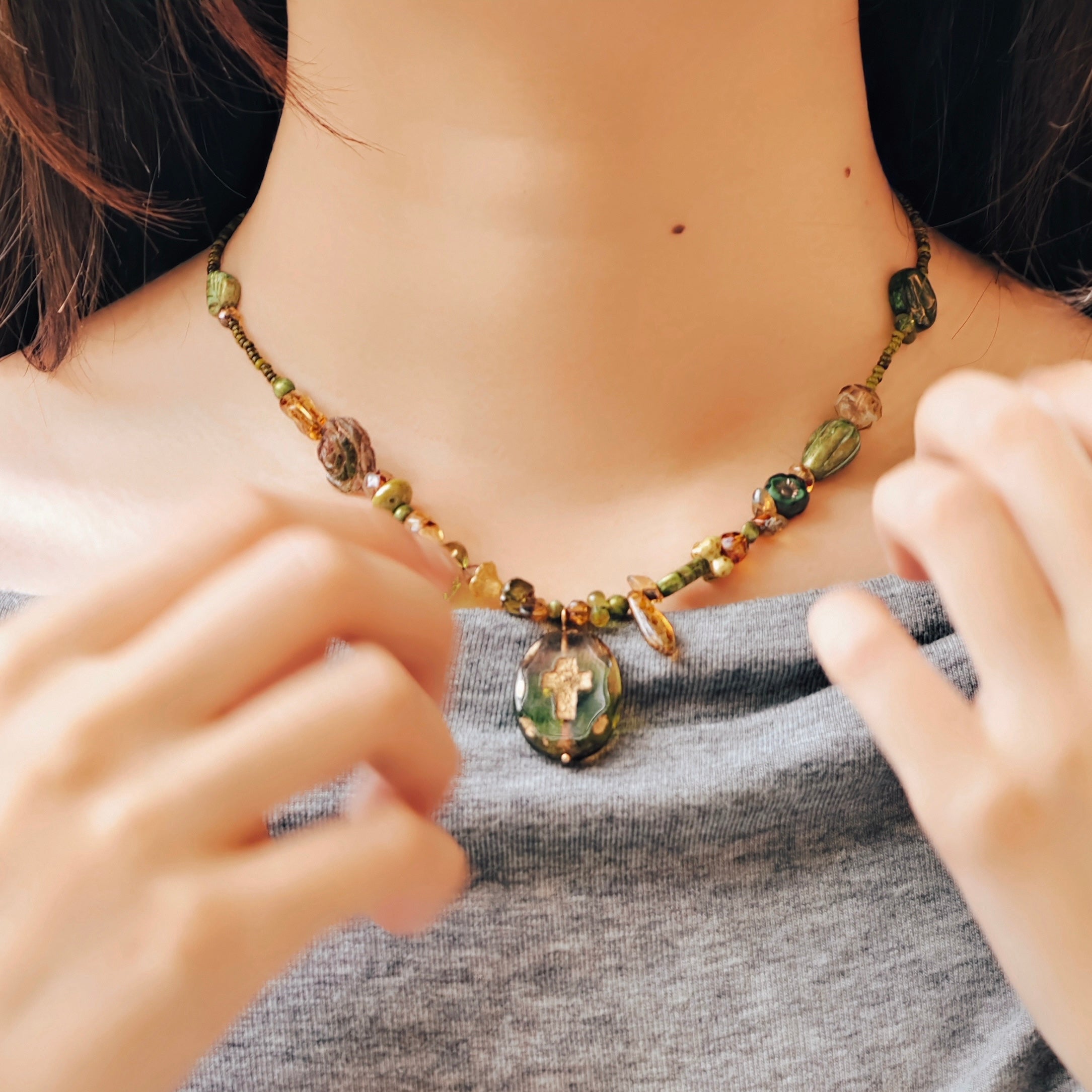 Each piece is hand-strung with carefully mismatched Czech glass beads, Japanese seed beads, and gold-plated spacers, arranged in gentle asymmetry to reflect the beautiful disorder of the forest.