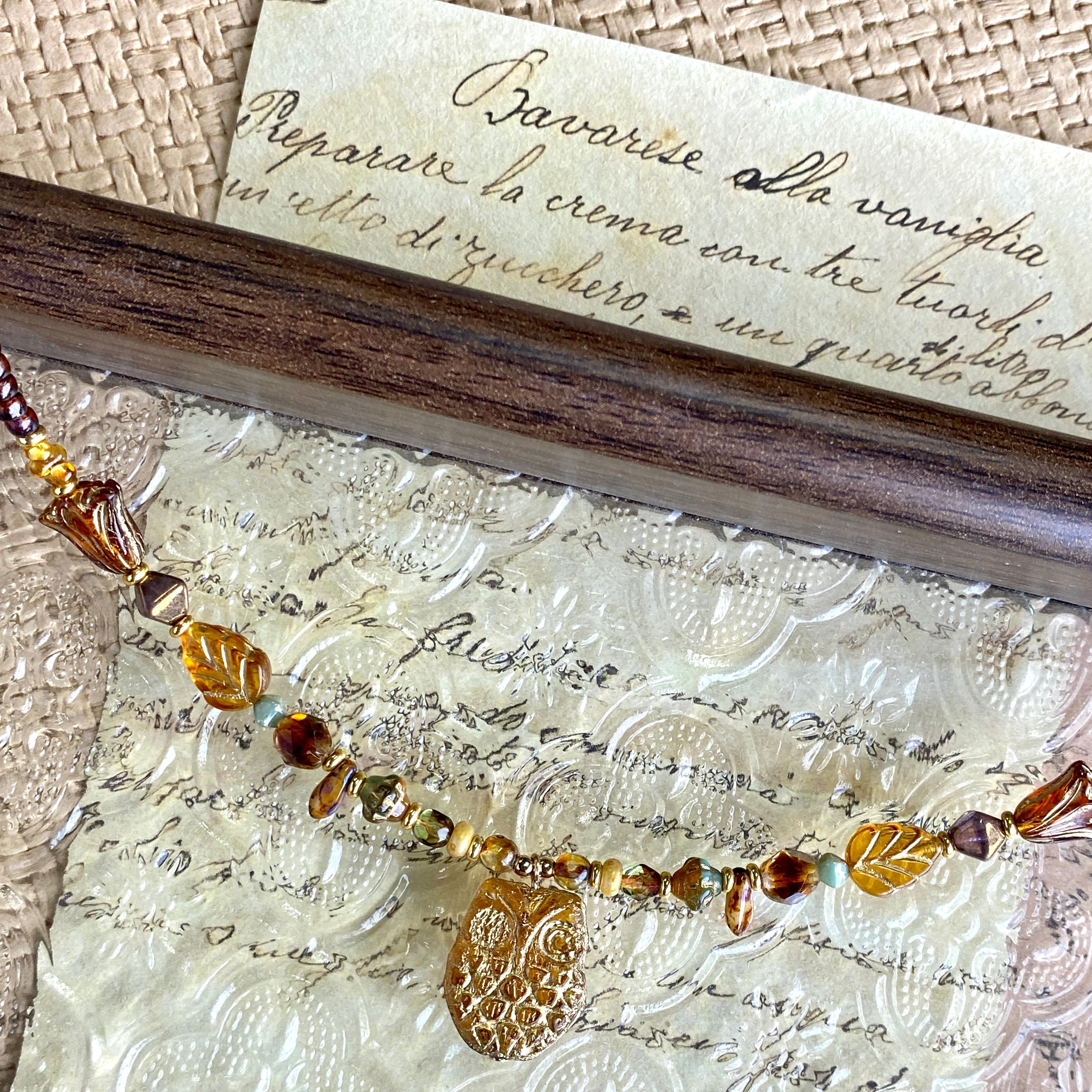 A golden owl rests at the center — textured, almost ancient — surrounded by Czech glass leaves, mossy greens, and shadow-toned beads.