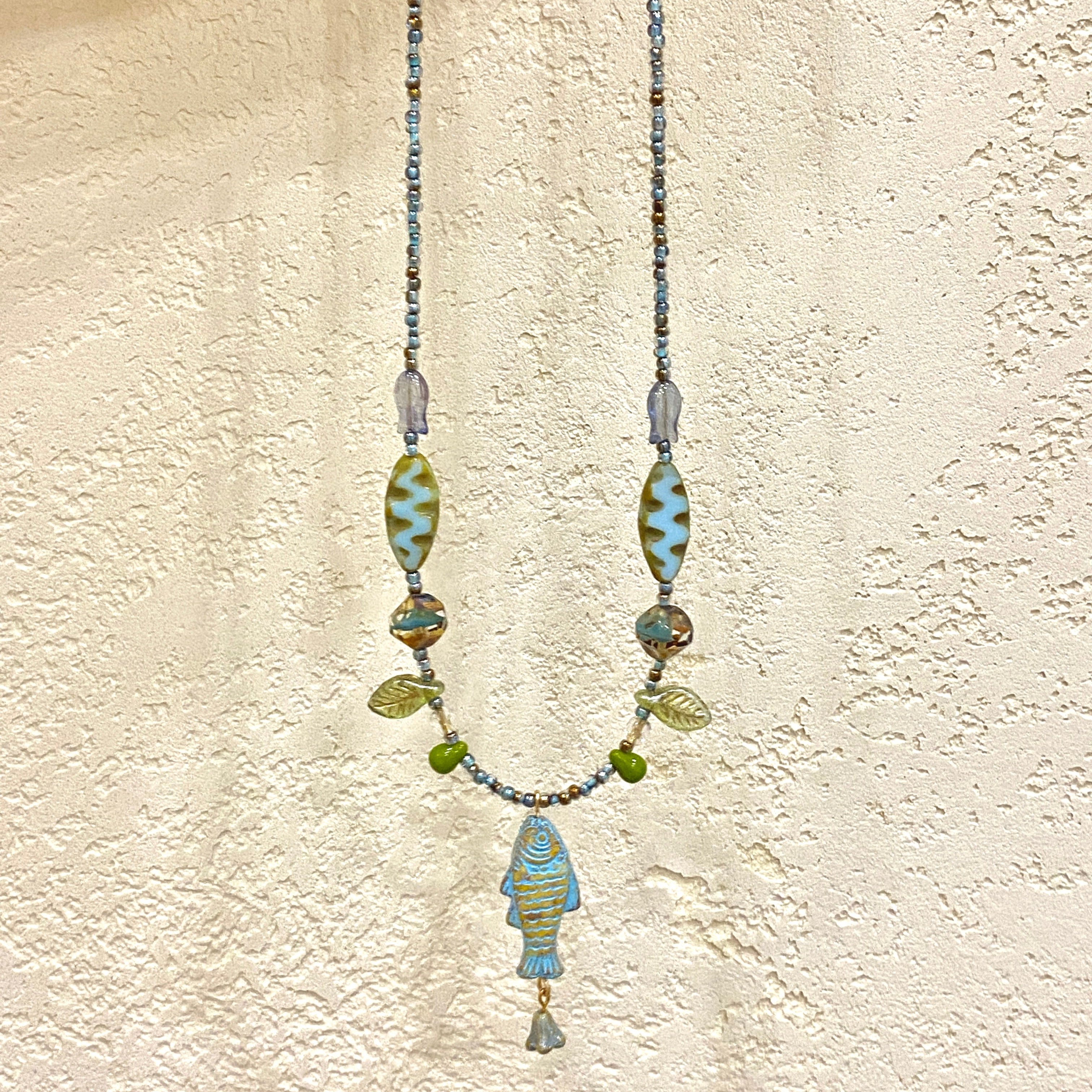 Inspired by serene waters and hidden forest streams, this handmade necklace features a charming blue-green fish pendant, paired with Czech glass leaves, heart-shaped beads, and shimmering seed beads. Each detail tells a quiet story of nature and whimsy, making it a perfect piece for lovers of slow living and forestcore aesthetics.