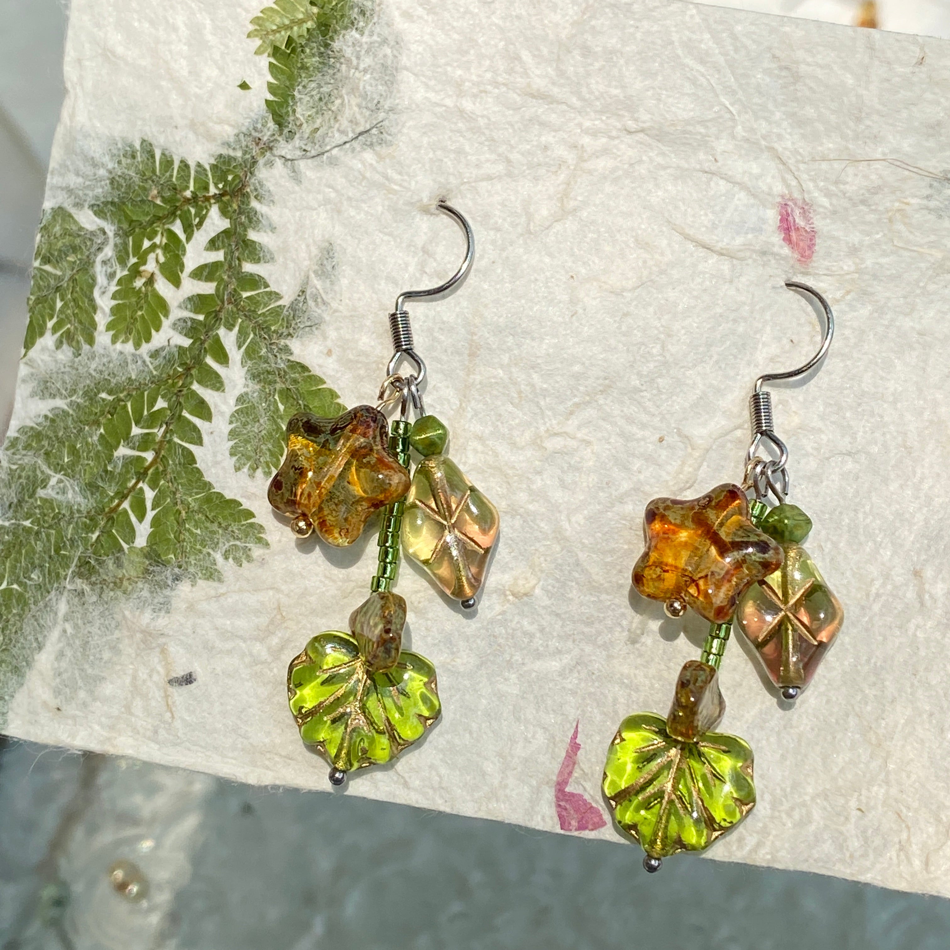 Starweed is a forest-floor constellation — amber-hued Czech glass stars, mossy greens, and dappled sunlight. Each element is hand-assembled with 925 sterling silver, crafted to move like leaves in a slow breeze.